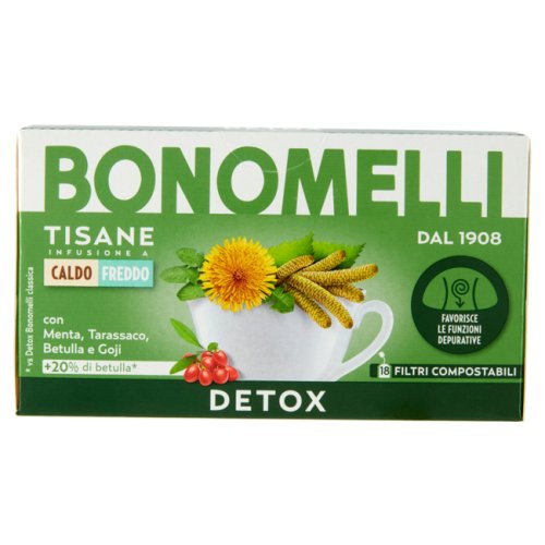 Menta foglie (Mentha x piperita L.) 41,7%, betulla foglie (Betula pendula Roth) 12%, liquirizia radice (Glycyrrhiza glabra L.), tarassaco parte aerea-radice [Taraxacum officinale (L.) Weber ex F.H.Wigg.] 8%, arancio foglie [Citrus aurantium subsp. sinensis (L.) Engl.], curcuma radice (Curcuma longa L.) 5%, carciofo foglie (Cynara scolymus L.) 3%, estratto secco di menta (Mentha x piperita L.) 3%, aromi naturali, vitamina C 2,3%, succo di bacche di goji disidratato (Lycium barbarum L.) 2%.