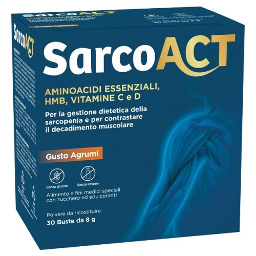 Alimento a fini medici speciali a base di aminoacidi essenziali, HMB (beta -idrossi-beta -metilbutirrato), vitamina C e vitamina D, scientificamente formulato per la gestione dietetica della sarcopenia o di condizioni caratterizzate da decadimento muscolare (stati di fragilità, patologie acute o croniche accompagnate da perdita di massa muscolare) per le quali SarcoAct può favorire il mantenimento e il recupero della forza e della massa muscolare.